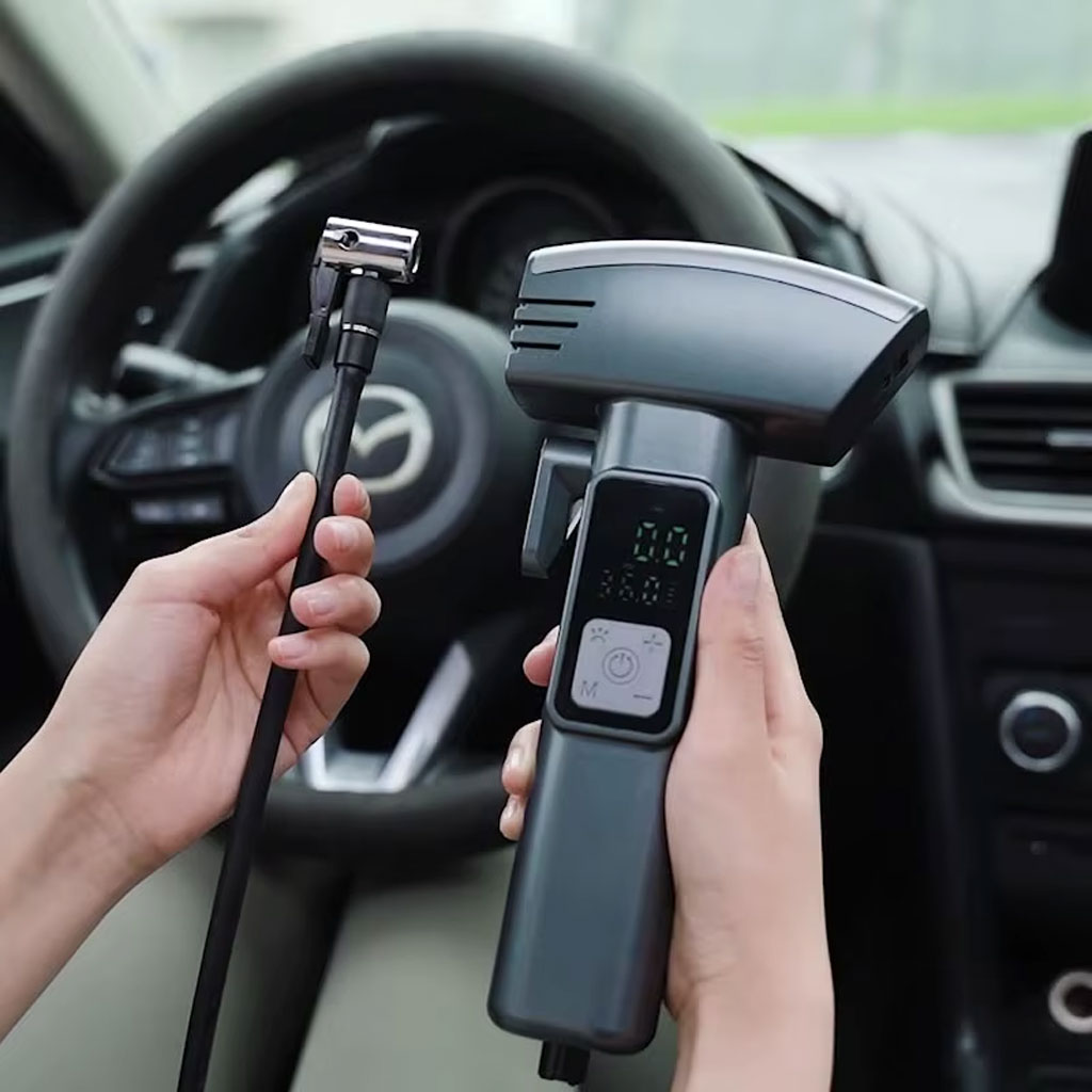 منفاخ هواء ذكي، قوي، آمن، وسهل الحمل — رفيقك المثالي على الطريق سواءً كنت تسافر، تتخيّم أو تواجه حالة طارئة.
