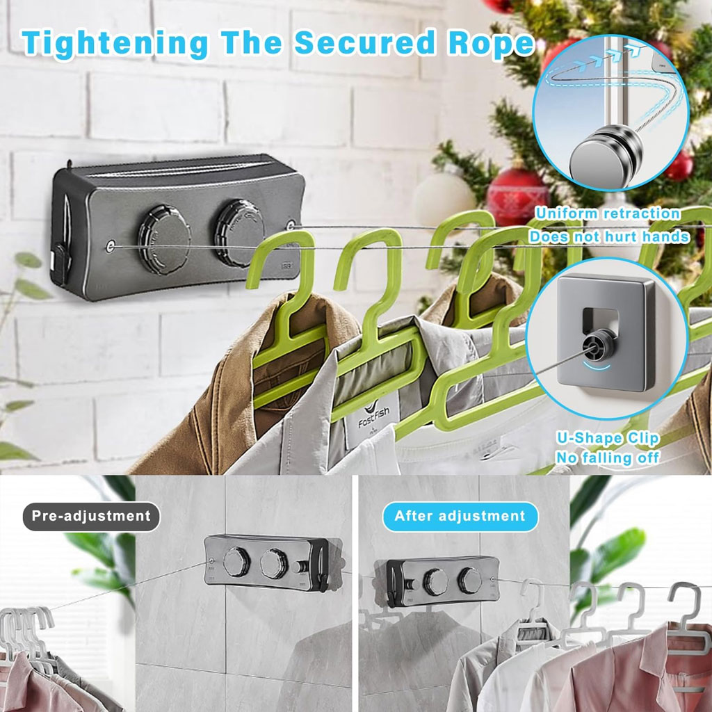 📏 قدرة تحميل أكبر : سلك مزدوج من الفولاذ المقاوم للصدأ يتحمّل حتى 22 كغ، ويمتد حتى 5 mètres (16.7 pieds). مناسب لنشر كمية كبيرة من الملابس في مساحة صغيرة.