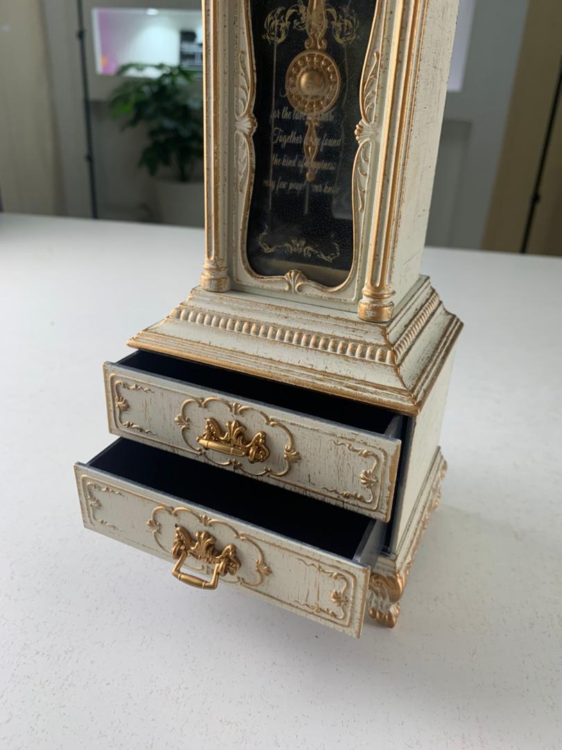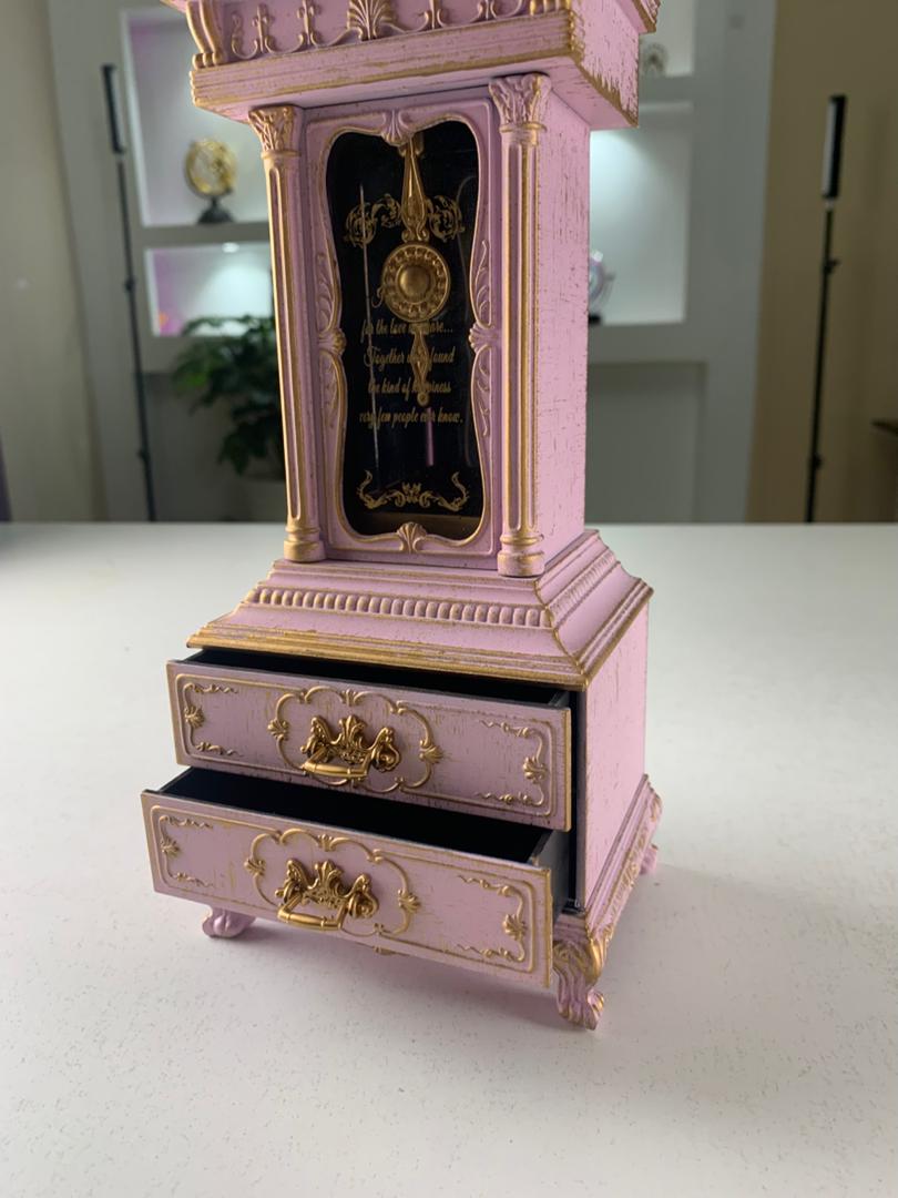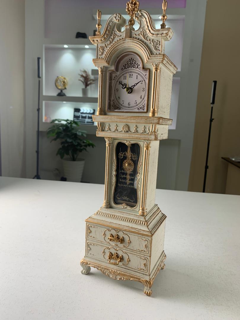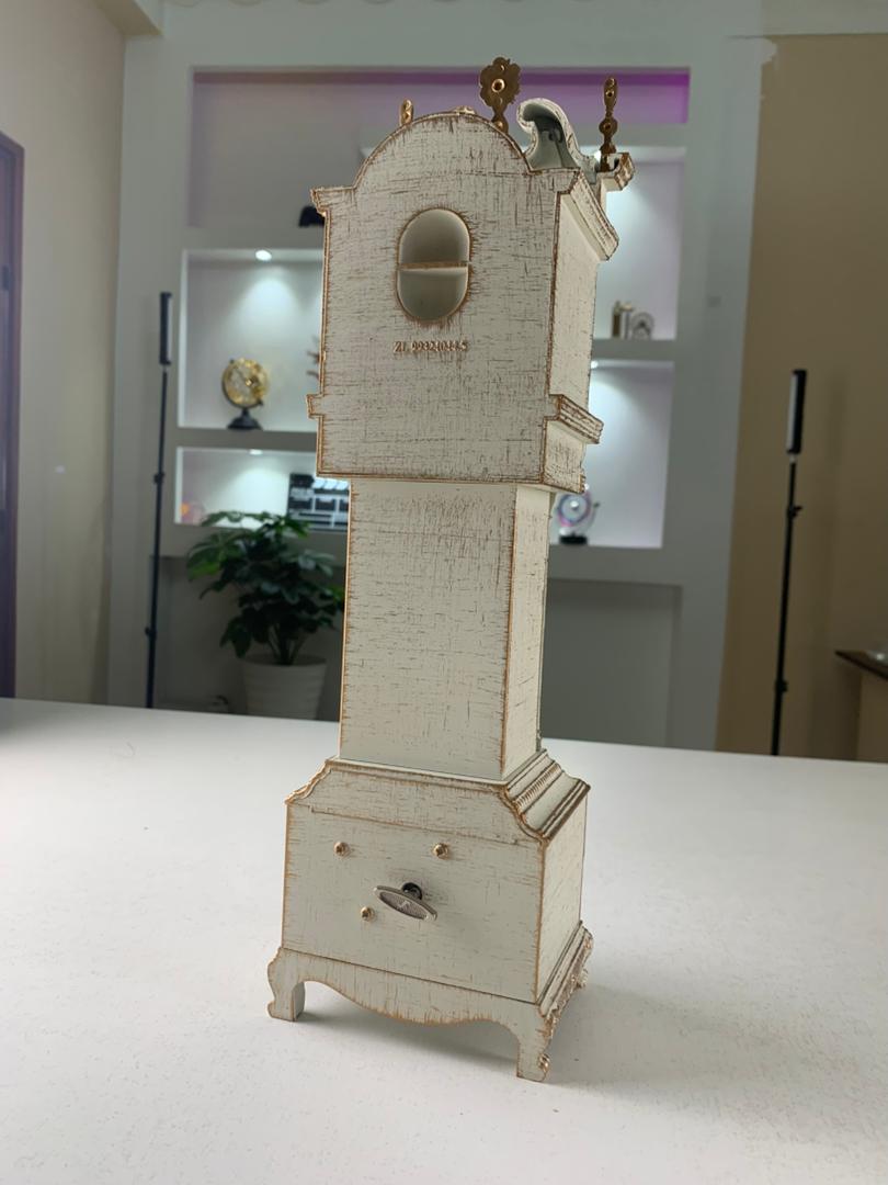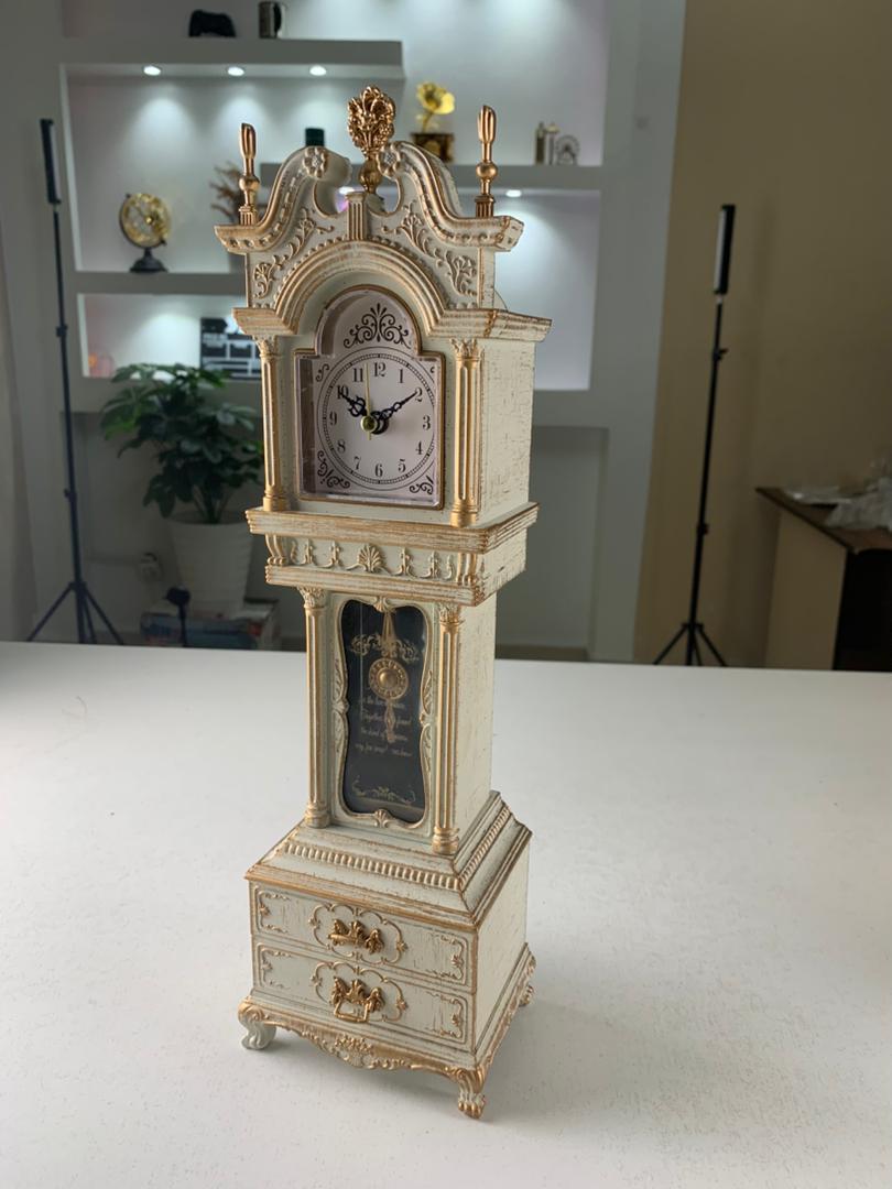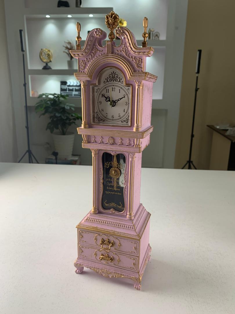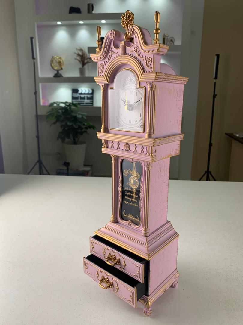 لا يشترط أن تكون الساعة الدائمة قطعة أثاث بمستوى النظر: فساعة "الجدة" المزودة بصندوق موسيقى لا يتجاوز طولها 40 سم، لكنها تبدو رائعة على خزانة الأدراج أو البوفيه. وفي هيكلها البلاستيكي ذي الكسوة العتيقة، تخفي صندوق موسيقى يعمل بالزنبرك (على ظهر الساعة). يمكن سماع لحن "لوريلي" عند فتح الدرج الأمامي. كما يمكن فتح الدرج السفلي لتخزين الأشياء الصغيرة، مثل المجوهرات. آلية الساعة كهربائية وتعمل ببطارية AA واحدة (تباع منفصلة).