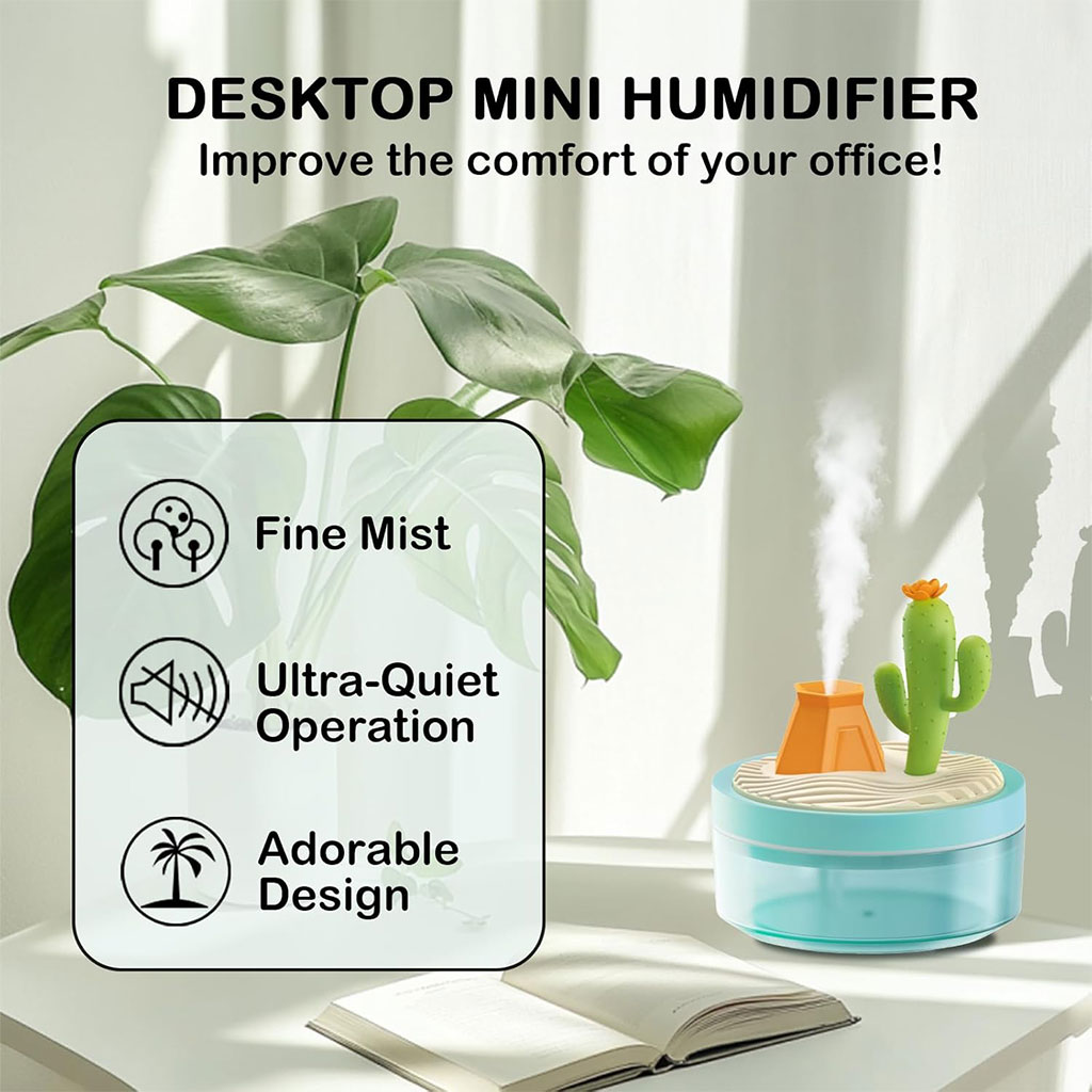 مرطب الهواء هذا يأتي بحجم مثالي (12.4 × 12.4 × 13.5 سم) ليكون إضافة رائعة على مكتبك أو في غرفتك.
