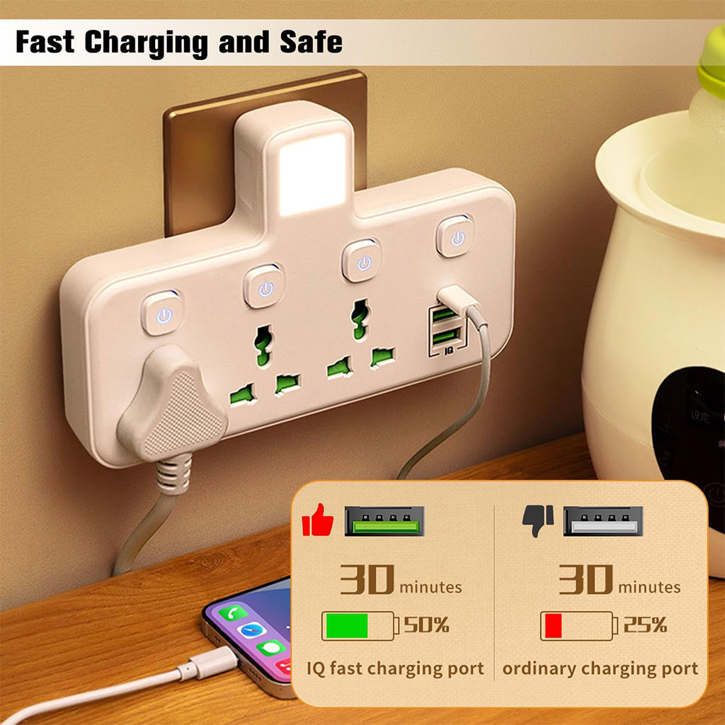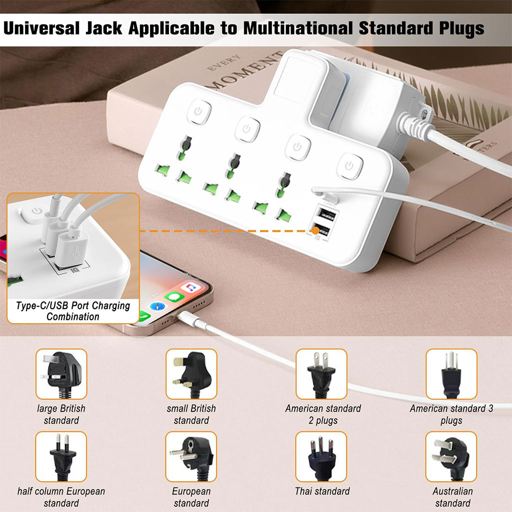 🌍 منافذ عالمية : تدعم مختلف أنواع المقابس العالمية، مثالية للسفر أو للاستخدام مع أجهزة متعددة.