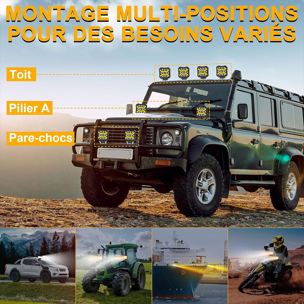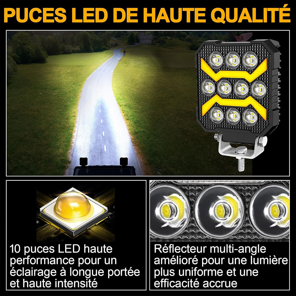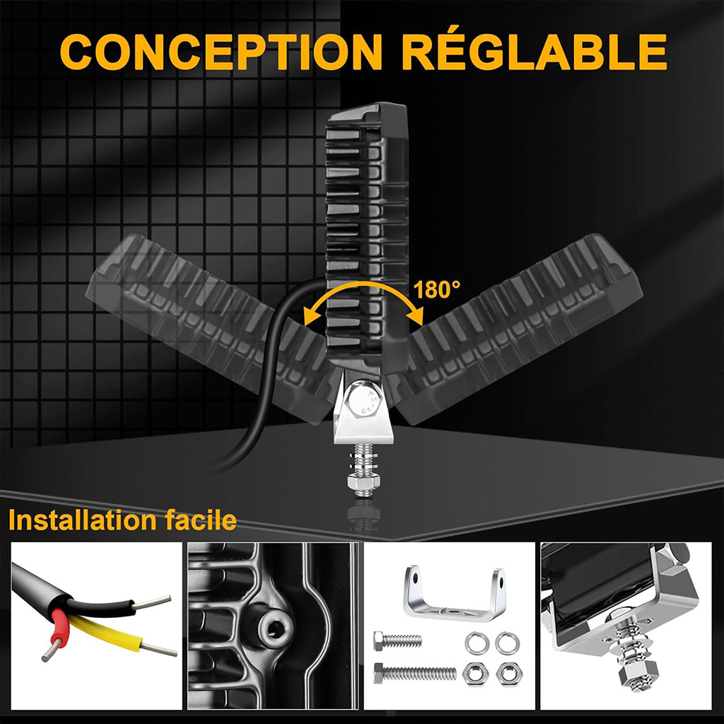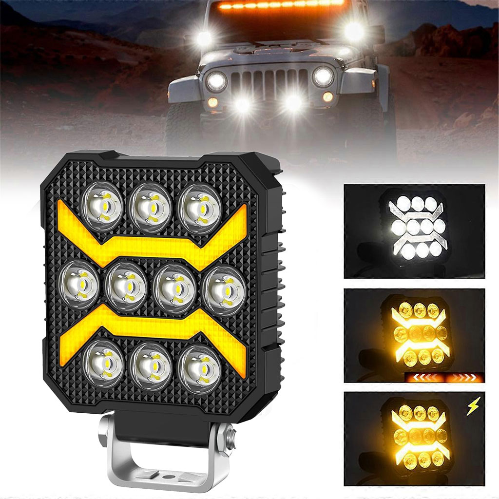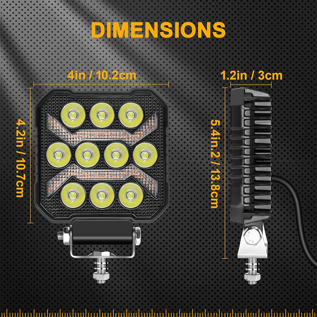 يستخدم ضوء العمل LED من AnTom عدسة عاكسة بزاوية واسعة جدًا تصل إلى 120 درجة لتوفير إضاءة قوية وموزعة بشكل أفقي متساوٍ. في المنتصف، يجمع المصباح بين 10 شرائح بيضاء 6500K نوع 3030 و شريحتين صفراوين 3000K، مما يمنحك 3 ألوان مختلفة و5 أوضاع تشغيل. يمكن ضبط الضوء الأصفر من وضع الإضاءة الثابتة إلى وضع الوميض، لتجمع بين الإضاءة العملية وضوء التحذير في نفس الوقت.
